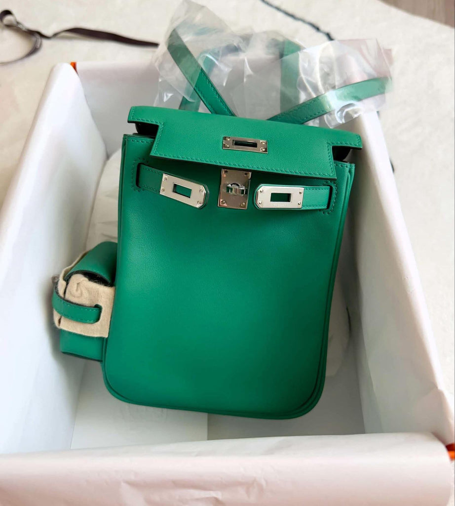 The Kelly Jump is a Spring/Summer 2024 release from Hermès, inspired by the structure of the Kelly Ado and the practicality of the Kelly Moove. It’s a hybrid between a backpack and clutch, designed for dynamic lifestyles while retaining signature Hermès elements: the flap, straps, and touret turn-lock closure. In Vert Vertigo — a vivid, saturated green — and crafted from smooth Swift leather, this piece feels fresh, modern, and daring. The Palladium hardware adds graphic contrast, and the W stamp confirms production in 2024.