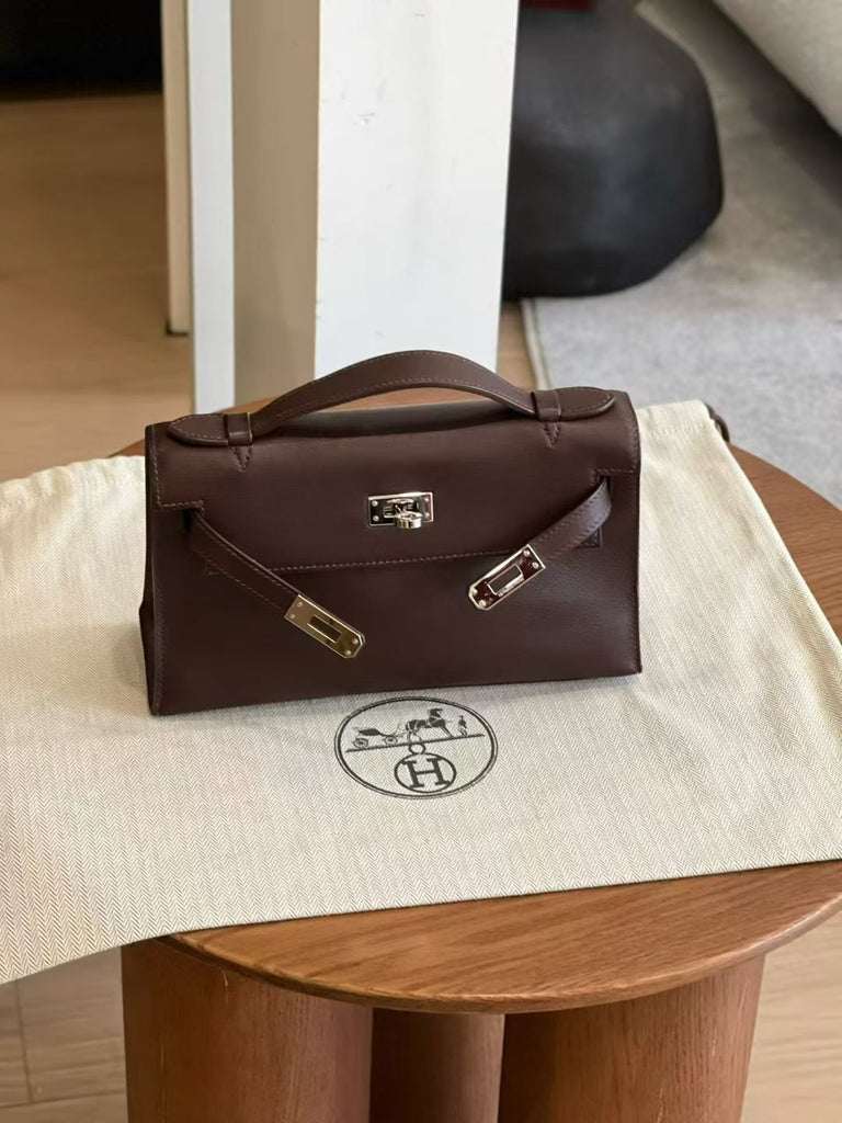 The Kelly Pochette is Hermès’ iconic clutch, designed as a miniature version of the classic Kelly, without the shoulder strap. In Chocolate — a rich, warm brown — and crafted from Evergrain leather, this piece feels exceptionally elegant and versatile. Finished with Palladium hardware, it offers a crisp, modern contrast. The K stamp confirms production in 2024, and the bag is in Excellent condition, with a sharp silhouette and pristine hardware.