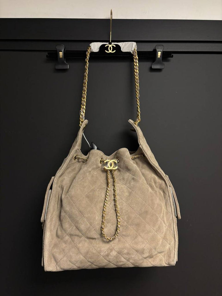 Crafted from soft, velvety suede, this bag features a relaxed hobo silhouette with Chanel’s signature diamond quilting and standout details such as two side pockets with CC turn‑lock closures. The spacious main compartment is secured with a drawstring adorned with a gold CC logo, giving the model a casual yet luxurious feel.