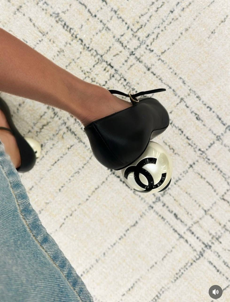 Heel: Imitation pearl — large sculptural sphere with black Chanel logo