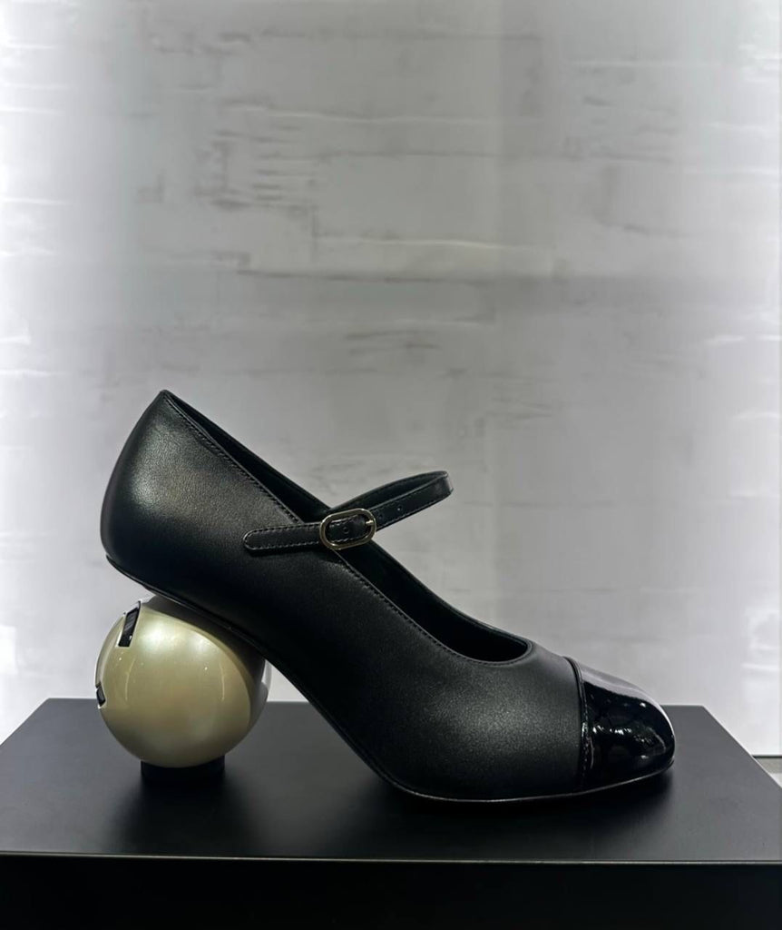 The Mary Janes from Chanel’s Fall-Winter 2025/26 collection reinterpret a timeless classic with luxurious materials and a bold, artistic heel. Crafted from stretch lambskin, they feature patent leather accents and the brand’s signature oversized pearl heel — a spherical structure adorned with the black Chanel logo. This pair is more than footwear; it’s a statement of style.