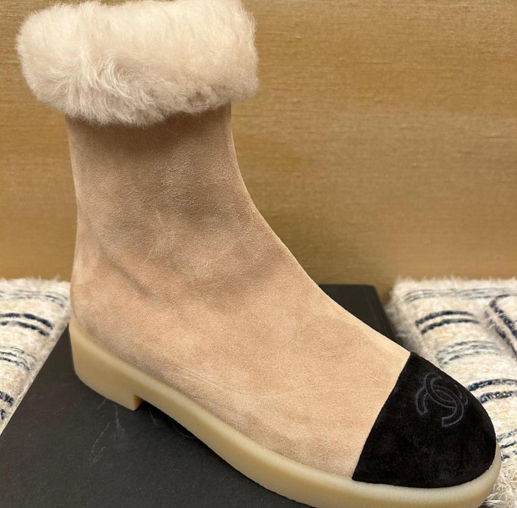 These high boots from the Coco Neige collection embody Chanel’s winter chic. Crafted from natural shearling sheepskin, they feature a soft beige suede upper, a signature black leather toe cap with the CC logo, and a plush fur cuff for added warmth and volume. Perfect for resort wear, city styling, or après-ski looks.