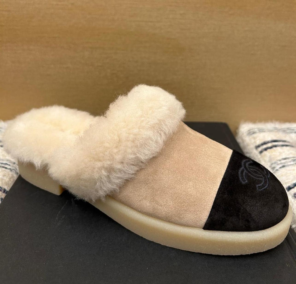 ChanelChanel Shearling Sheepskin Mules — Beige Suede, Cream Fur, Black Toe Cap with CC Logo